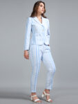 A refreshing twist on classic tailoring, this light blue linen suit features asymmetric stripes that add both elegance and visual interest. The airy linen fabric ensures all-day comfort, while the design strikes a perfect balance between structured and relaxed.
